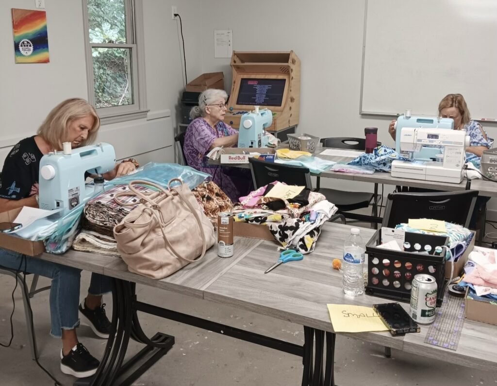 My sewing volunteer friends rallied and dug up all their best training from 4H and their early home economics classes. The machines did not let us down, and the weather was perfect.