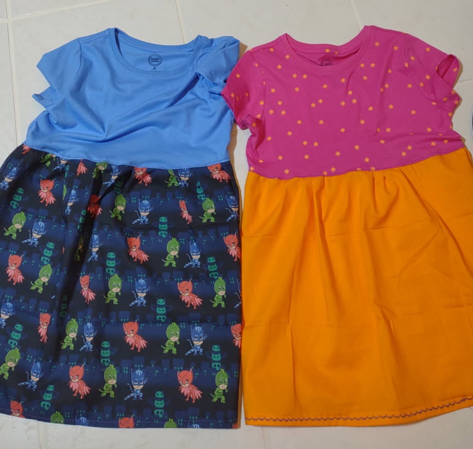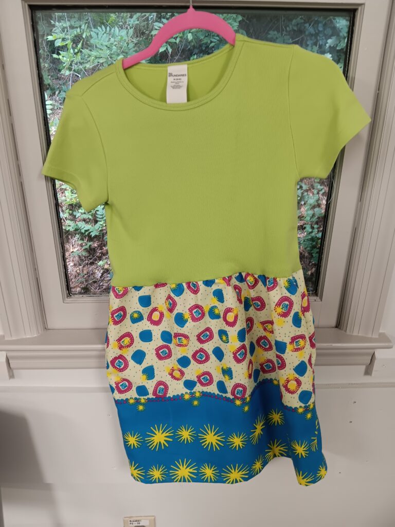 I put together a prototype dress. This is a dress made of a simple girl’s t-shirt and a gathered skirt. It can be put together in an hour. I gathered all sorts of material I had in my fabric stash. I purchased these girls’ t-shirts in as many colors as they had. I decided I wanted to try to make a unique dress for each girl.